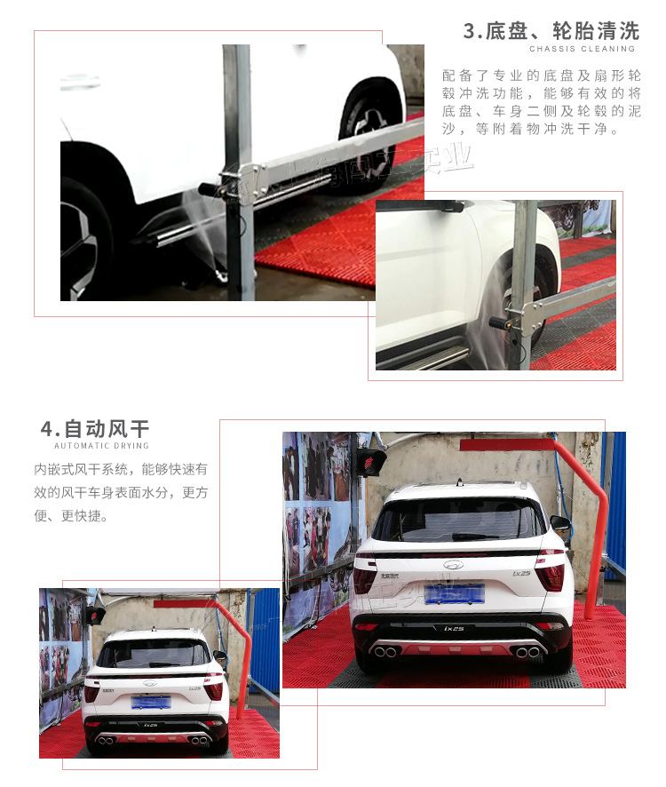 闖王風尚型全自動洗車機,高壓泡沫無需人工操作,自動調比。通過混合、霧化等步驟,形成微顆粒狀,噴灑覆蓋車身表面,接觸污漬,包括車身縫隙都夠均勻覆蓋;360°旋轉式高壓沖洗,勻速、勻壓、勻距的沖洗方式,清洗盲區(qū);配備底盤及扇形輪轂沖洗功能,能夠有效的將底盤、車身二側及輪轂的泥沙,等附著物沖洗干凈;自動風干